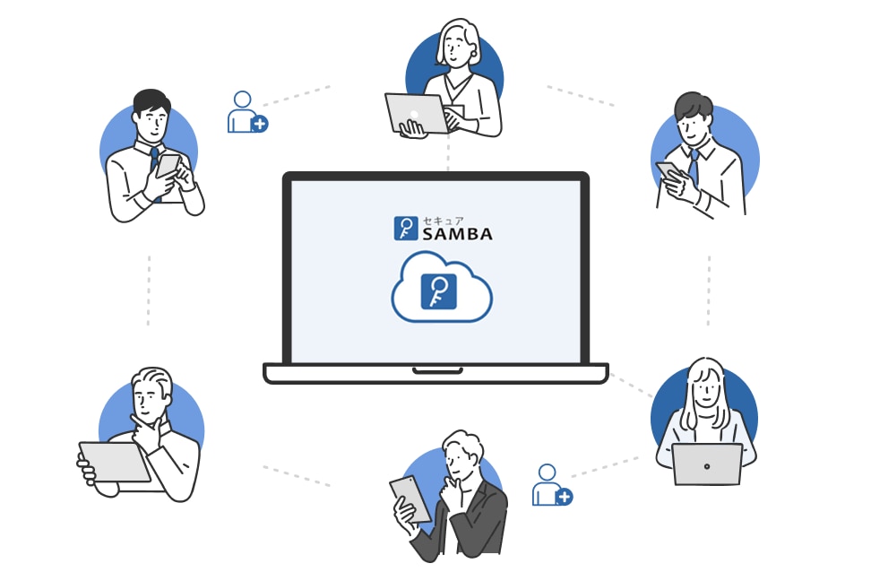 セキュアSAMBAは、ユーザーIDを発行することで、社内の方だけではなく、サービスを導入していない取引先とも、安全にファイル共有できます。