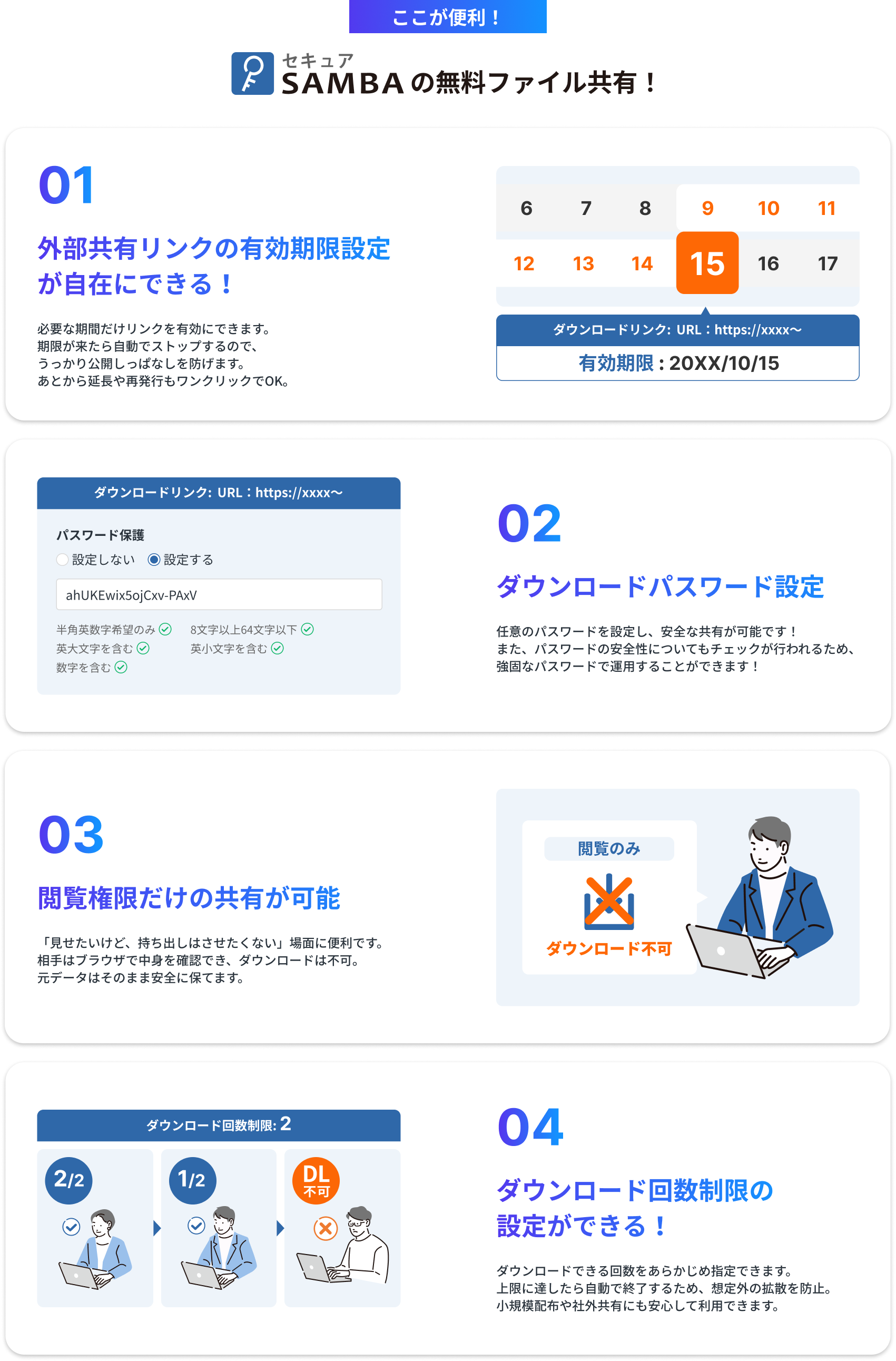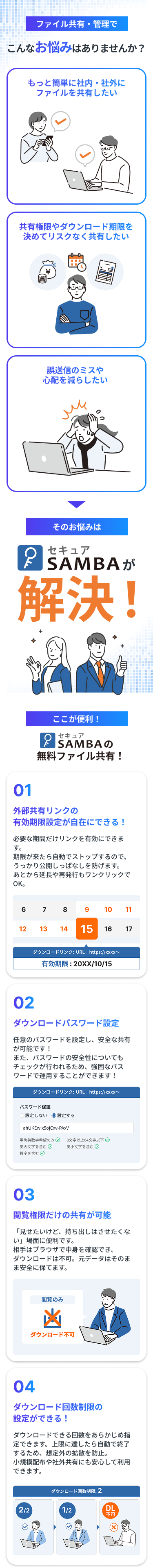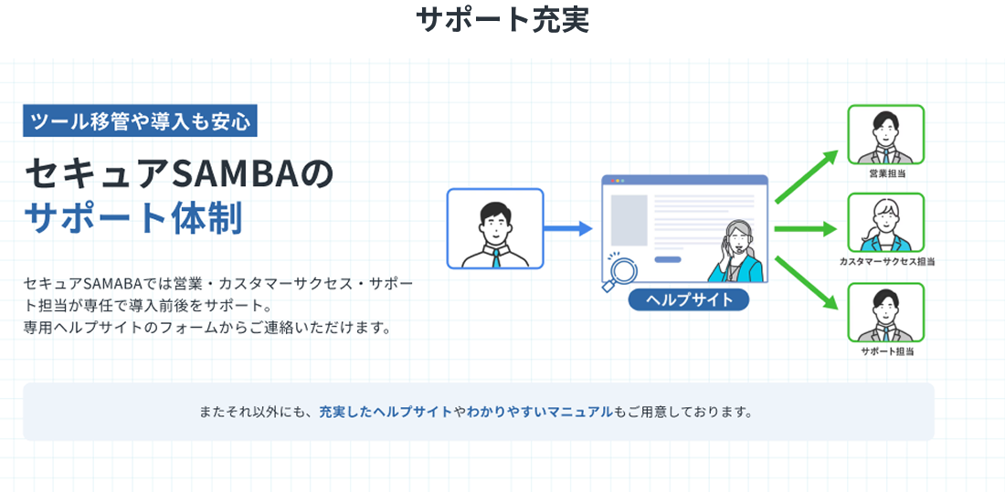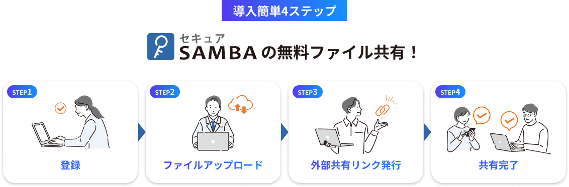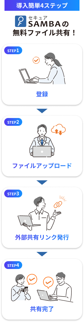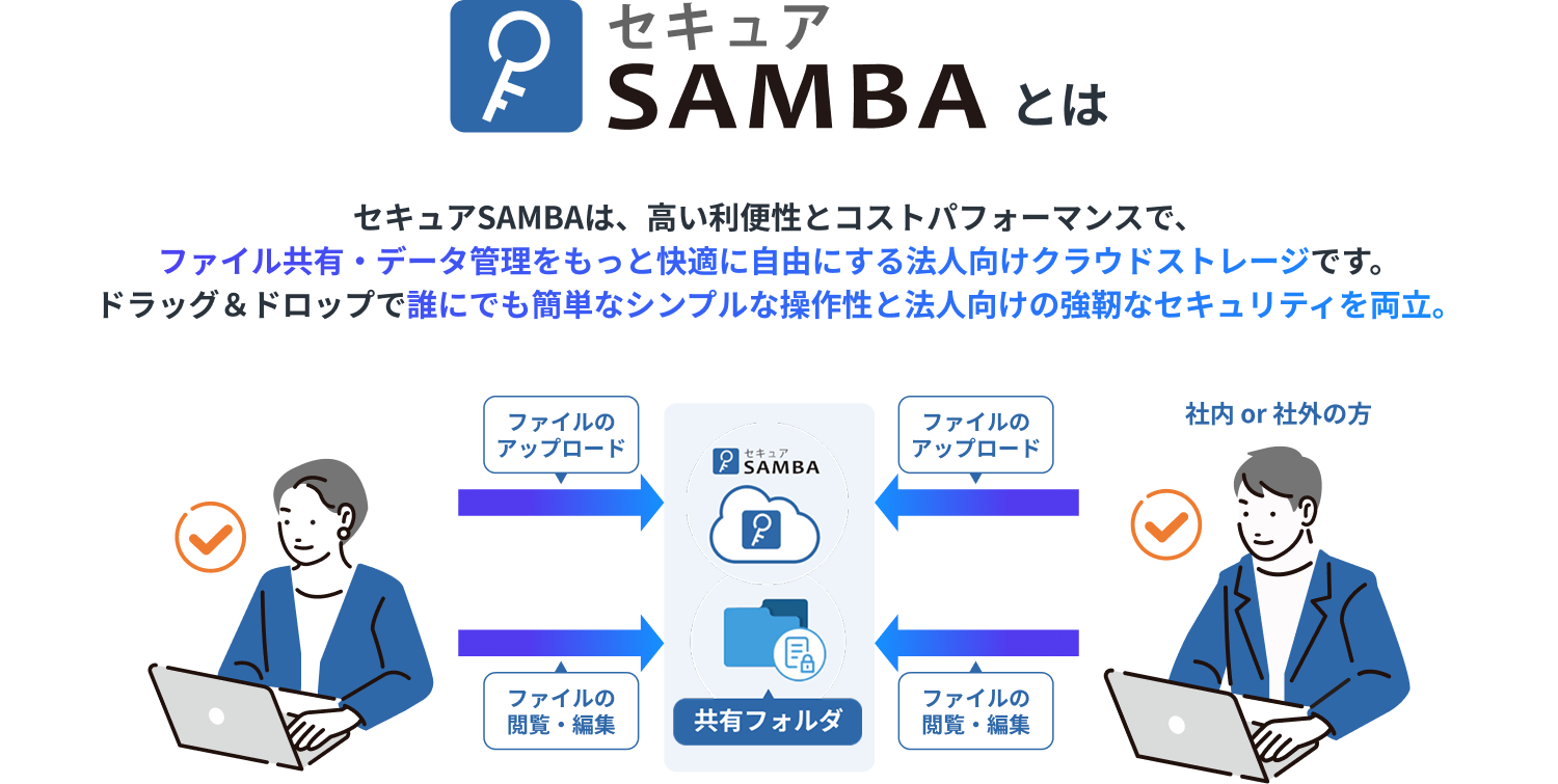 用途 | セキュアSAMBAを無料で長い期間試してみたいお客様 | 社外共有のみでのご利用や、小規模プランから容量追加していきたいお客様向け | 1ファイル毎の容量が大きい場合や、不特定多数へのファイル転送でご利用のお客様向け |